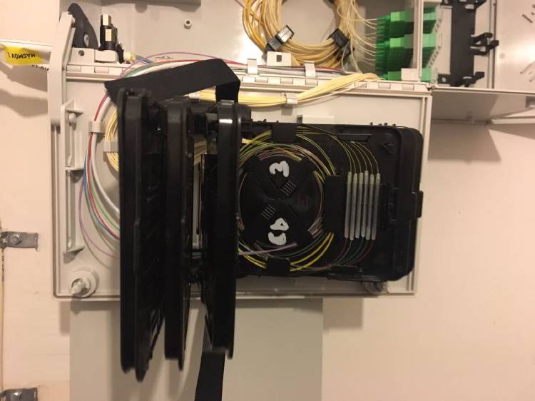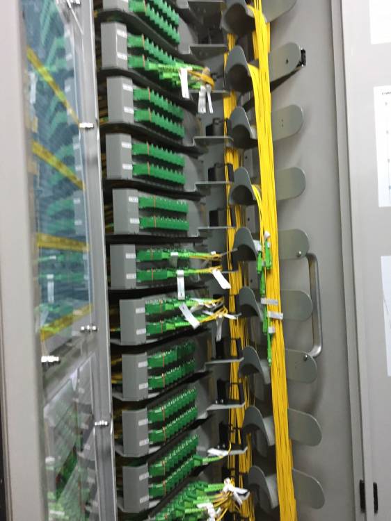 En la misma sala OBA, podemos observar, además, el armario repartidor de Fibra Óptica (ODF) que sirve de punto de interconexión entre la cabecera de red (OLT) y los cables que conforman la red de fibra que se instala a lo largo de la población hasta llegar a cada edificio.