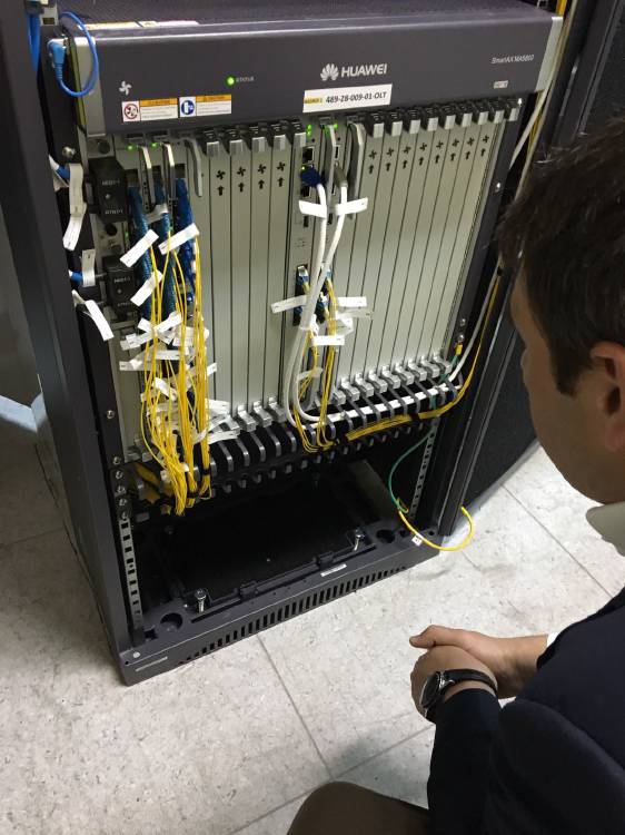 La visita comienza en la sala llamada OBA de la Central de Telefónica de Algete, que es la cabecera de fibra donde tenemos co-ubicados nuestros equipos de transmisión de red, así como la cabecera de Red de Fibra u OLT (Optical Line Terminal) propia de MÁSMÓVIL . Éste el equipo donde se configuran los servicios contratados por cada cliente, así como el punto de integración del tráfico de voz y datos de la población para facilitar la Transmisión del servicio hasta la red de MÁSMÓVIL .